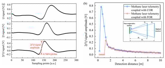 (a) Observed signals at a detection distance of 0.8 m from the methane laser telemetry system coupled with COR. (b) The 2f/1f signal amplitude of the methane laser telemetry system coupled with COR or Fresnel lens variations according to detection distance.