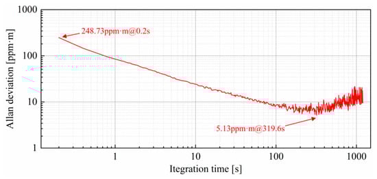 To evaluate the detection limit of the methane laser telemetry system coupled with COR, the 300 ppm·m methane was continuously monitored for more than 1200 s with the scan frequency of 5 Hz. Figure 13 shows the Allan deviation analysis for the continuous measurement. The Allan deviation reflects the fluctuation of the measurement result with the passage of the integration time. It indicates that the optimum integration time was 319.6 s, and the corresponding detection limit was 5.13 ppm⋅m. When the integration time was within 320 s, the trend of the Allan deviation decreasing was basically the same as ~1/sqrt(τ), which indicates that thermal noise of passive device was dominant in the measurement results at this time. When the integration time was over 320 s, increasing the integration time could not further improve the detection limit.