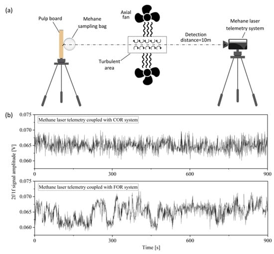 A comparative experiment was implemented by using a methane laser telemetry system with COR and the system with FOR. For both systems, the sampling period of the methane laser telemetry sensor was 0.5 s. The methane gasbag with an integrated concentration of 300 ppm⋅m was monitored at a detection distance of 10 m within 900 s. The calibration experiment of the signal amplitude of the methane gasbag was completed in the laboratory indoor in advance, and the signal amplitude at this integrated concentration was 0.0652 V. Two industrial axial flow fans were placed on both sides of the laser light path, and the fan wind speed was set at 12 m/s to simulate the atmospheric turbulence area. The schematic diagram of outdoor experiment and the 2f/1f signal amplitude data of these two systems are shown in Figure 14.
