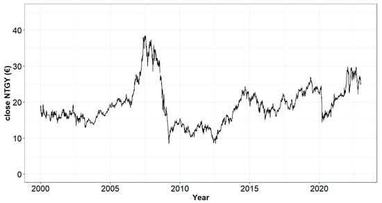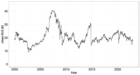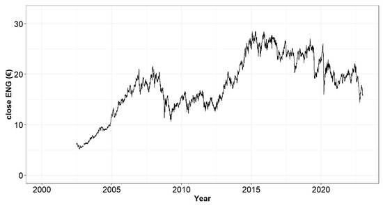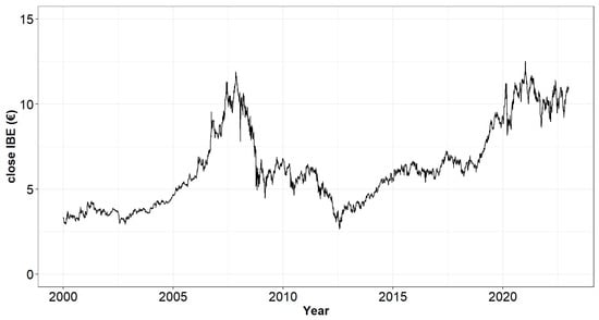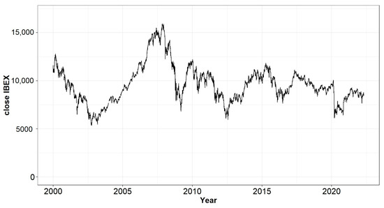 Figure 1, Figure 2, Figure 3, Figure 4, Figure 5 and Figure 6 show the stock closing prices of the six companies under study from 3 January 2000 to 30 December 2022, except in the case of ENAGAS (Figure 1), whose data starts on 26 June 2002. Figure 7 also shows the IBEX35 index closing prices from 3 January 2000 to 30 December 2022 of this index. Please note that the information used for the training of the models proposed in this article will be only that corresponding to these time series.