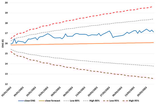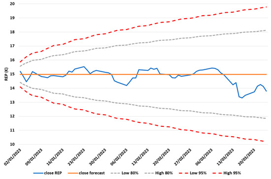REP stock closing prices from 2 January 2023 to 24 March 2023. Closing values, forecasted closing values, and 80% and 95% confidence intervals of the forecasting of the exponential smoothing ANN model.