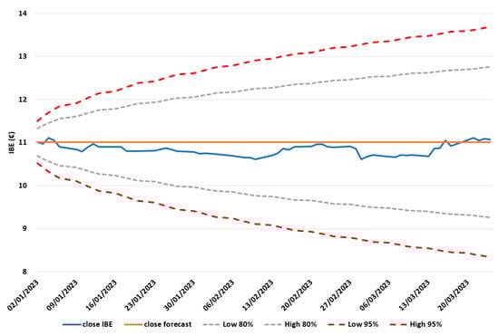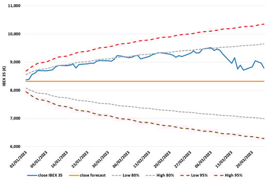 IBEX35 index closing prices from 2 January 2023 to 24 March 2023. Closing values, forecasted closing values, and 80% and 95% confidence intervals of the forecasting of the exponential smoothing ANN model.