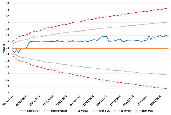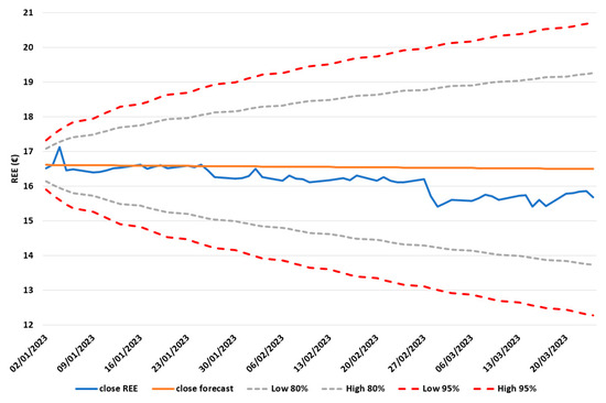 Table 4 shows the mean-squared error (MSE), root mean squared error (RMSE) [44], mean absolute error (MAE) [45], and percentage of points inside the 80% and 95% confidence interval of the models of the study when those models, calculated with historical prices from 2000 to 2022, are employed to forecast the prices from 2 January 2023 to 24 March 2023 and the forecasts obtained are compared with real values.
