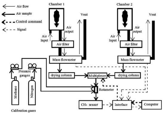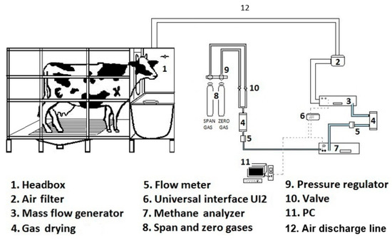 Figure 4 details the schematic diagram of the open-circuit chamber utilized to measure methane from cattle.