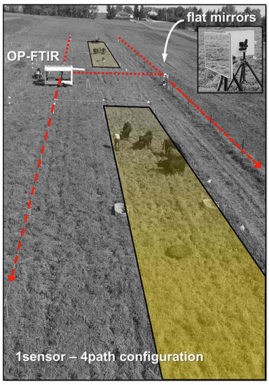 - Flesch, T.K.; Basarab, J.A.; Baron, V.S.; Wilson, J.D.; Hu, N.; Tomkins, N.W.; Ohama, A.J. Methane emissions from cattle grazing under diverse conditions: An examination of field configurations appropriate for line-averaging sensors. Agric. For. Meteorol. 2018, 258, 8–17. [Google Scholar] [CrossRef]