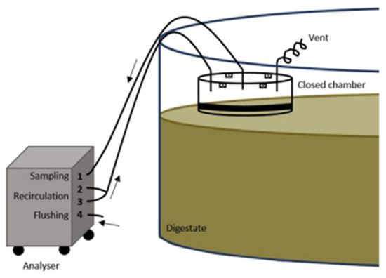 The premise of the manure storage methods is that methane is produced from its decomposition and can be measured by the examination of its levels in different storage facilities. The review examined studies that quantified methane emissions from slurry storage sites and biogas plants where manure was stored. Vergote et al. [43] used an on-line gas phase analyzer to quantify the CH4 and N2O emissions from farm-state mono-digested dairy manure through uninterrupted monitoring processes in an on-site digestate storage for a period of three months. The method is similar to the closed chamber approaches involved the accumulation of gases where the emission rate was quantified [43]. The results showed that methane emissions ranged from 4.6 to 14 g m−3 d−1 per day, while the nitrous oxide emission varied from 0.004 to 0.13 g m−3 d−1 [43]. The results further indicated that total emissions of the greenhouse gases ranged between 170 and 478 g [CO2, eq.] m−3 d−1, where only 10% was attributed to N2O. Furthermore, increasing the volume of the digestate and the temperature also led to increased CH4 and N2O emissions. Figure 6 illustrates the closed chamber used in measuring methane and nitrous oxide.