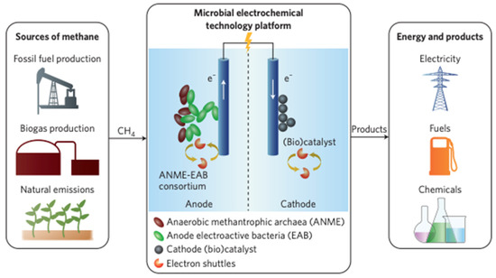 - McAnulty, M.J.; Poosarla, V.G.; Kim, K.-Y.; Jasso-Chávez, R.; Logan, B.E.; Wood, T.K. Electricity from methane by reversing methanogenesis. Nat. Commun. 2017, 8, 15419. [Google Scholar] [CrossRef]