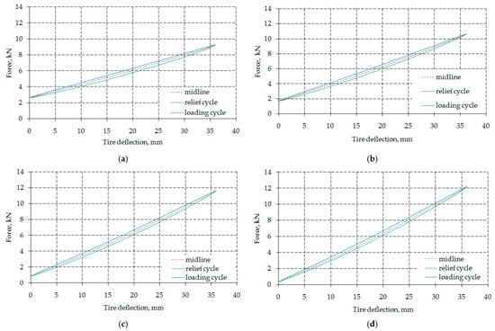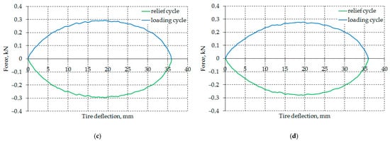 As part of the first stage of the experiment, four radial characteristics were determined for each tire on the front axle of the test vehicle (Figure 4), from which the stiffness, damping, and hysteresis coefficients were identified.