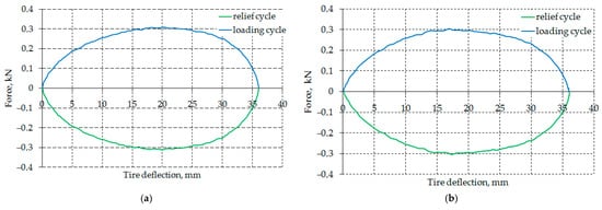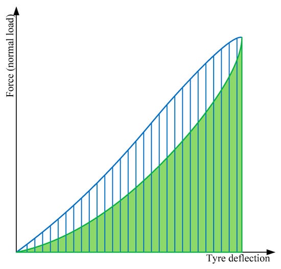 In addition, the tire structure’s energy consumption was estimated based on the hysteresis loop’s waveform. The difference between the work involved in loading the tire (LU) (field hatched vertically) and relieving the load (LO) (green field) expresses the value of energy lost to vertical deformation of the tire (Figure 7).
