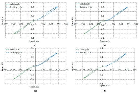 Due to the fact that the wheel loading rate is known for each point of the work diagrams (Figure 8), it is possible to designate the damping profile (Figure 9) for each of the diagrams.