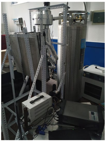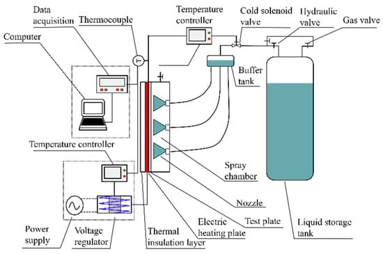 The schematic of the experimental system is shown in Figure 1. The liquid-supplying system, heating system, and measuring system comprise the open-loop spray cooling system. Electric heating sheets and the voltage regulator are the main components of the heating system. The liquid-supplying system includes nozzles, the liquid storage tank, the solenoid valve, and the buffer tank. There is one inlet and nine outlets in the buffer tank, which can distribute the coolant from the liquid storage tank. The solenoid valve is controlled by the temperature controller. The temperature controller can regulate the temperature of the test surface by adjusting the flow of the working fluid through the solenoid valve. The thermocouples and the data-acquisition instrument in the measuring system are the main instruments to monitor the temperature distribution of the test surface. The spray cooling experimental platform of LN2 is shown in Figure 2.