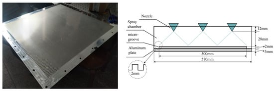 Five different surfaces, including the micro-grooved surface and the test surface covered by porous foam, were investigated in this study. As shown in Figure 5, the smooth flat surface (Ra < 0.25 µm) is 570 × 570 × 3 mm, constructed of 7075 aluminium, and the cooled area is 500 × 500 mm.