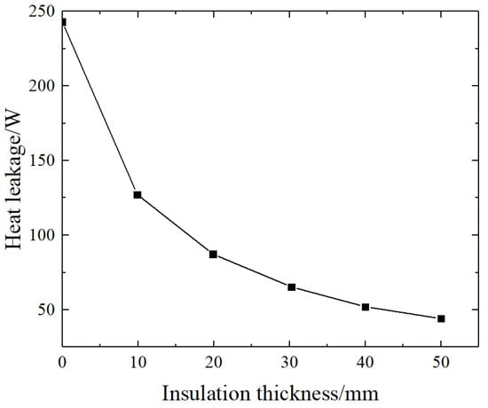In order to minimize heat loss, it was necessary to insulate each component. In this paper, foam polystyrene was used as the insulation material and each component was insulated using the stacking insulation method. The foam polystyrene thermal conductivity was 0.42 W/(m·K). The relationship between the heat leakage and the insulation thickness is shown in Figure 8, and the thickness of the insulation layer used in the experiment was 30 mm.