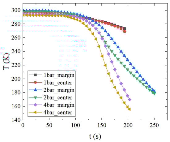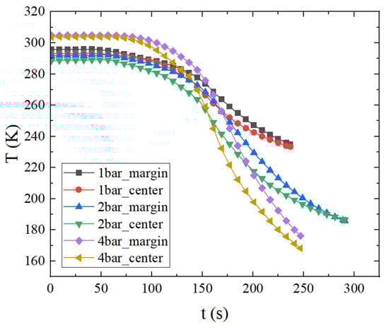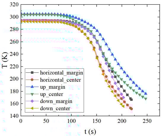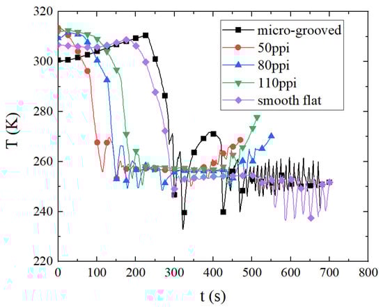 The temperature in Figure 9 was the average temperature of the cooled surface. As can be seen from Figure 9, it took 36 s, 26 s, 40 s, 41 s, and 35 s for the temperatures of the smooth flat surface, micro-grooved surface, 50 ppi copper foam, 80 ppi copper foam, and 100 ppi copper foam to decrease from 303.05 K to 261.67 K.