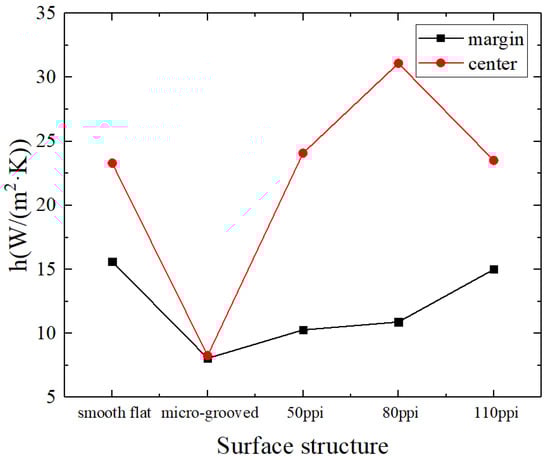 By comparing the heat-transfer performance of different surfaces, it was found that all five surfaces could achieve the goal of rapid cooling, and the temperature-control response time was less than 1 min. The heat-transfer coefficients of different surfaces are shown in Figure 10. It could be seen that the heat-transfer coefficients of the surface with micro-grooves were lowest, while the heat-transfer coefficients of the smooth flat surface and the surface covered with copper foam were similar. According to Figure 9, only the smooth flat surface could achieve the stability of low temperature control under the high heat flux. Therefore, the smooth flat surface was used in the subsequent experiments.