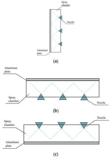Schematic of different spray directions. (a) Horizontal spray; (b) vertical up spray; and (c) vertical down spray.