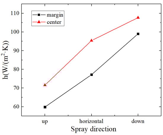 - With the increase in the surface spray pressure, the surface heat-transfer coefficient increased. The results showed that the surface spray strengthening of the heat-transfer coefficient increases linearly along with the change of pressure, but the increased rate under a different spray direction was different, and, when spraying down, the surface heat-transfer coefficient with the increase in the pressure rate was higher.