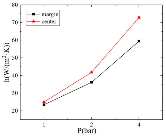 It can be seen from Figure 15 that increasing the pressure could increase the surface cooling rate. When the spray pressure was 105 Pa, the surface heat-transfer coefficient was 24.22 ± 0.78 W/(m2·K); when the spray pressure was 2 × 105 Pa, the surface heat-transfer coefficient was 38.99 ± 2.84 W/(m2·K); and when the spray pressure was 4 × 105 Pa, the surface heat-transfer coefficient was 66.25 ± 6.72 W/(m2·K).