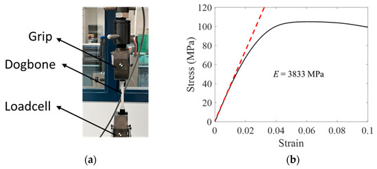 An ASTM standard D638M-10 [51] tensile test was used to obtain the elastic properties of the polymer. As shown in Figure 3, the elasticity of the sample was calculated by finding the slope of stress–strain data in the linear region (i.e., 3833 Mpa). Because most vibrations occur in low amplitudes, the linear part of the curve can effectively model the elastic properties of the polymer.