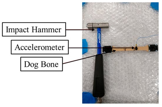 An experimental modal analysis (EMA) was performed on the structure to validate the FE model. An impact hammer modal test was performed on dog bone specimens made of PEEK. The roving impact hammer method was implemented on all test samples with the accelerometer at a fixed location. To minimize mass-loading effects, a tear-drop accelerometer, which has a tiny mass, was used to capture the response. Two layers of bubble wrap were used as the base to replicate the free–free condition of the dog bone specimen, as shown in Figure 5. A total of 10 points were marked on the dog bones.