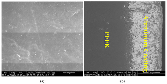 A Philips FE1 Quanta 200 environmental scanning electron microscope (ESEM) was used to image polyetheretherketone’s microstructure (PEEK) and PEEK with an aluminum coating. As shown in Figure 6a, the ESEM secondary micrograph of the PEEK sample shows dark reflective regions. The ESEM image shows a dense homogenous microstructure with no significant damage for PEEK with a relatively uniform surface. The homogenous microstructure of the PEEK allows us to create a homogenous finite element model. Additionally, Figure 6b illustrates the backscattered image of the PEEK with an aluminum coating. Figure 6a has a higher magnification (3660×) than Figure 6b (272×). Additionally, the aluminum coating covers the entire surface and has a less homogenous microstructure than the substrate. The manufacturing process was performed to have fewer defects, such as pores and gaps. The aluminum coating was deposited on the PEEK material to improve the adhesion of the interface. All glass fiber-reinforced PPA, PPS, and PEEK were provided by Solvay Specialty Polymers. They were molded using an injection molding process. A thermal spray process applied zinc or aluminum or aluminum-bronze coatings. The size of the matrix in the microstructure was obtained using ESEM images.