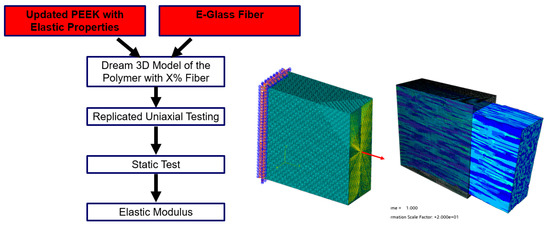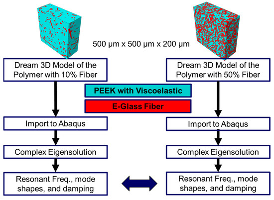 In this section, the FE model of the microstructures was created in Abaqus. Eight-node linear brick elements (C3D8) [53] with an element size of 1 µm were used for the models. This element size allows five elements along the diameter of the glass fibers. The material properties obtained for PEEK using EMA and tensile tests were applied to the model. For the fiberglass, nominal values were used. The finite element simulation can compare different models, as shown in Figure 8.