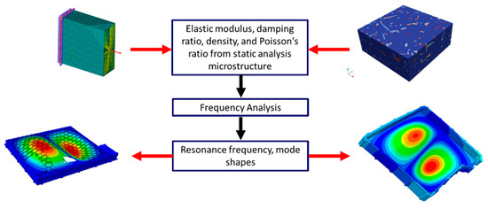 Microstructure modeling has been extensively used in material science for designing materials with superior static and fatigue behavior [36,37,38,39,40]. Herriott et al. [41] developed a multi-scale framework for predicting material properties in additive-manufactured materials. Microstructure modeling has also been used for creep prediction in composites [42]. The microstructure of materials can affect their vibrational properties [43]. Hence, there has been an increasing interest in the microstructures of materials in recent years and their effect on their mechanical properties. Amirian et al. [44] studied the effect of microstructure changes in metals on vibrational properties using modal tests and finite element analyses. They found that the changing microstructures could significantly affect the damping loss factor. Damir et al. [45] used modal analysis to characterize the fatigue behavior in austempered ductile iron (ADI). They showed that the damping ratio changed with the iron hardness and fatigue life. Several approaches, such as representative volume element (RVE), were used to model the fibers in the microstructure. Our study is innovative and straightforward as it includes the fibers and their direction in the microstructure. This approach provides more flexibility and allows the exploration of the structure’s microstructural research for any mechanical analysis, such as dynamic and vibration analysis. Additionally, another innovation of our study is to consider the microstructure for the NVH analysis of full-size structures. Despite the extensive work on using microstructure modeling for static studies, the number of studies that evaluate microstructure modeling to study the vibration properties of structures is limited. Most researchers only consider macro-level modeling [46,47,48,49] in vibration analysis.