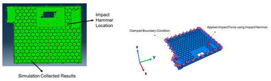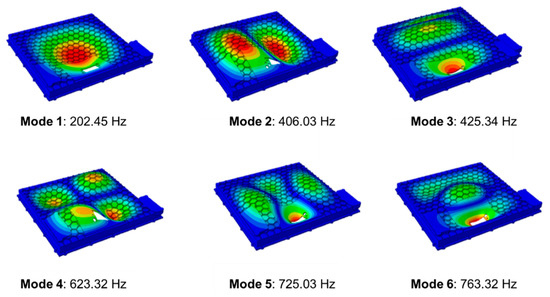 The microstructure model was used to obtain the material properties of the composite for the actual structure. It should be noted that the macro model of an existing structure could not be directly developed using the microstructure with different volume fractions because it has high computational costs. Thus, the material properties for the macro model were obtained from the micromodel simulation. A complex eigensolution was performed on the model to obtain the microstructure’s mode shapes and resonant frequencies. The complex eigensolution provides resonant frequencies, mode shapes, and damping values for the composite model (see Figure 9). The damping values were used in the macro model. These dynamic properties could also be obtained using direct frequency analysis. This type of analysis would allow for frequency-dependent material properties but would have higher computational costs.