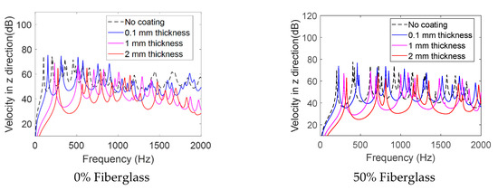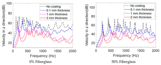 In addition, the velocity in the z-direction (dB) (see Figure 14 for the coordinates of the model) was analyzed and compared for different aluminum bronze coating thicknesses, namely 0.1 mm, 1 mm, and 2 mm, and two PEEK base materials with 0% and 50% fiberglass, as shown in Figure 16. As can be seen in Figure 16, The PEEK base part with a 2 mm aluminum bronze coating can shift the frequencies to the right. Additionally, it can be observed that the higher aluminum bronze coating significantly reduces the velocity in higher frequencies. Adding an aluminum bronze coating to PEEK can also shift the velocity of the surface of the material. The addition of an aluminum bronze coating to PEEK can alter the natural frequencies and modes of vibration of the composite material. Similar to aluminum, aluminum bronze is a relatively stiff material compared to PEEK. The stiffness of the coating can increase the overall stiffness of the composite material, which can lead to a shift in the natural frequencies of the system towards higher values. Additionally, the damping properties of the aluminum bronze coating can also affect the vibration behavior of the PEEK.