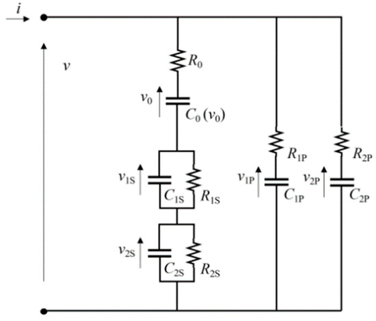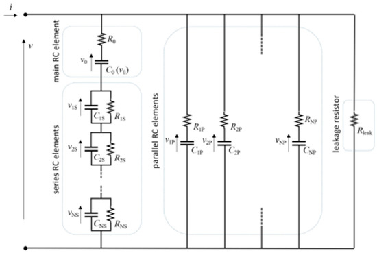 It is important to remember that a greater number of elements is useful for a greater accuracy of the simulated results compared with the experimental ones, but it makes the computational process more difficult; for this reason, a smaller number of elements was considered, obtaining a simplified equivalent circuit (Figure 3). In this circuit the leakage resistor is not taken into consideration because, in the specific case, the long-term behaviors can be neglected.