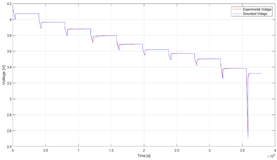 In general, the estimated parameters allowed us to accurately simulate the behavior of the cell both in discharge and in relaxation. The last discharge peak represents the end of the discharge, with the SOC near zero (Figure 4).