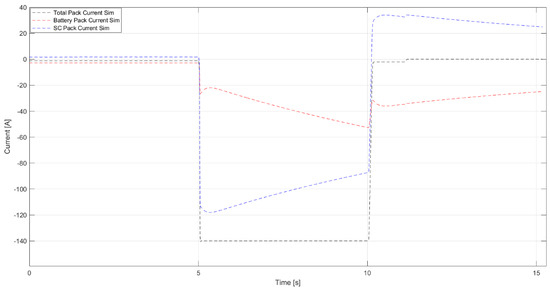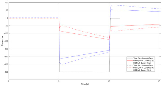The simulated current profile of the −350 A, 5 s test is shown in Figure 7; it is possible to observe that, regardless of the test current intensity, at the start of the discharge the current delivered by the SCs oscillates between 81 and 82% and, consequently, the battery cells deliver the remaining 18–19%, a current distribution that is a direct consequence of the resistance of the two branches.