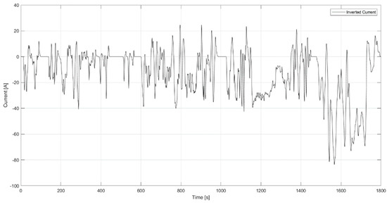 To proceed both with the simulations and with the experimental tests, it was therefore necessary to scale the current profile of the WLTP cycle while maintaining the scale factor already decided for the storage system. It should be remembered that the car’s battery pack has 5230 Wh, while the smaller-scale pack has 85 Wh. Based on this reduction in scale, a current profile is therefore obtained, which must be supplied by the storage system on a reduced scale. Knowing that, the real power and current cycles were reduced to satisfy these constraints. Thus was obtained a profile with 90 W of average power and 45 Wh of total energy (<75 Wh of the battery pack alone) and a maximum current of +24 A in charge and −83 A in discharge (Figure 9).