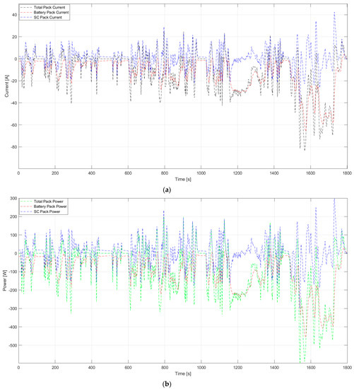 Once the current profile was loaded into the Simulink model, it was possible to analyze the current/power distribution of the two packs (Figure 10a,b).