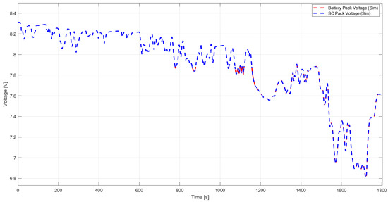 In Figure 11 we show the voltage graph in which, as seen in previous simulations, the profiles of the Li-ion cell branch and the supercapacitor branch are coincident.