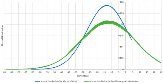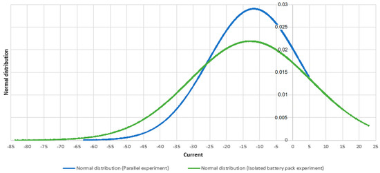 Performing a numerical analysis of these results, it is possible to collect also, for the experimental results, punctual values (Table 6) and Gaussian distributions. In Figure 17, the standard deviations of the battery pack current without the supercapacitor branch, and of the branch current with the Li-ion cells in the configuration of the storage system with supercapacitors in parallel with the batteries, are reported and compared. The parallel scheme is confirmed to have a much more favorable behavior, with lower maximum currents, operation of the cells much closer to the nominal conditions, and a drastic reduction of the peaks both in charge and in discharge. As foreseen and already demonstrated in the simulations, the presence of the supercapacitor branch significantly reduces the average current supplied by the cells; therefore, the production of heat due to the Joule effect is significantly reduced, to the full advantage of the cooling of the accumulation system and of the predictable useful life cycles.