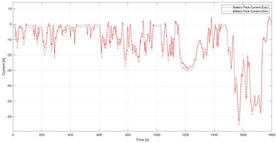 Considering now the experimental test of the WLTP cycle (scaled down), in Figure 14 is presented the comparison between the experiment and simulation current for the battery branch in the storage system with the supercapacitor branch in parallel with the Li-ion battery. The simulated one is slightly offset, and this is due to an imperfect balance of the pack voltages at the start of the test: specifically, the current of the battery pack begins the cycle from a discharge situation in favor of the supercapacitor branch, and this condition is maintained throughout the entire cycle. The overall behavior of the simulation model therefore proves to be sufficiently reliable during the WLTP cycle, which significantly represents a typical driving cycle for automotive applications.