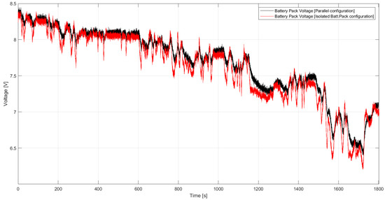 Figure 15 shows how the battery pack in the parallel configuration is subjected to lower currents and how the regenerative current is absorbed almost in its totality by the supercapacitor branch. At the same time, in Figure 16, where the voltage trends are reported for the same comparison, it can be seen how the battery pack in the isolated configuration is subjected to greater drops as well as violent and rapid voltage increases.
