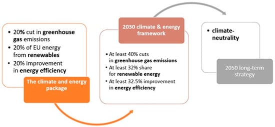 Reducing greenhouse gas emissions and developing a reliable strategy for saving fossil fuels is of particular interest to policymakers. In the area of climate policy, the European Union aims to achieve the so-called net-zero emission by 2050, which is the main postulate presented in the European Green Deal project. Over the 21st century, the proposed thresholds for reducing the emissions of gases responsible for global warming and the use of renewable energy sources are increasing [4]. Figure 1 shows the direction of the EU authorities’ action in the field of climate and energy policy [5].