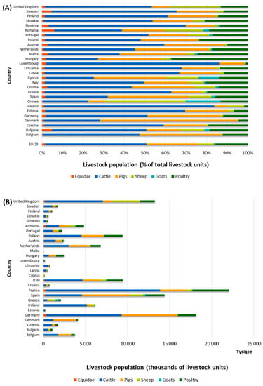 Figure 2. Livestock population in livestock units by type in Europe in 2016: (A) in % of total livestock unit; (B) total livestock unit (heads) [18].