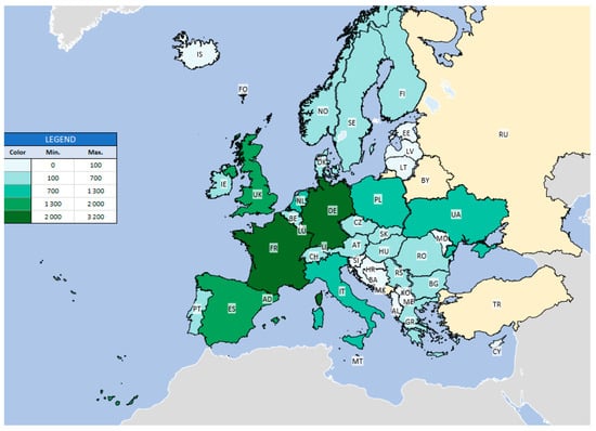 Figure 3. The realistic potential of methane production from manure in different European countries based on data estimated by Scarlat et al. [21]; value at mln m3 methane (yellow—not available).