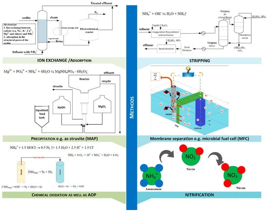 High ammonia concentration is a major problem in animal manure digestion, especially poultry manure. In addition, longer manure storage results in increased ammonia content, which is associated with the need for rapid waste management or effective removal of this toxic substance [9,10,52]. The simplest method of ammonia neutralization is to dilute the raw material with water; however, this involves a decrease in biogas yield, water consumption, and a large amount of secondary waste, which increases handling costs (pumping, storage, solids/liquid separation, and transport) [28]. Therefore, it seems right to use solutions that are less invasive to the environment, such as stripping with air or water vapor [53], adsorption processes [54,55], filtration techniques, nitrification [56], precipitation [57], ion exchange [58], or anaerobic oxidation [59,60] (Figure 5). Ammonia removal also promotes the recovery of nutrients from the feedstock by capturing ammonia from the carrier gas with scrubbers or traps such as sulfuric acid, creating high-end fertilizers that can be used for agricultural purposes [61]. Due to the possibility of digesting several wastes at the same time, which heterogeneously translates into process economics, the co-digestion technique seems to be particularly promising [11,16].