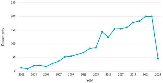 Figure 7. The number of publications on anaerobic digestion of animal manure in 2001–2023 (data status: March 2023) [85].