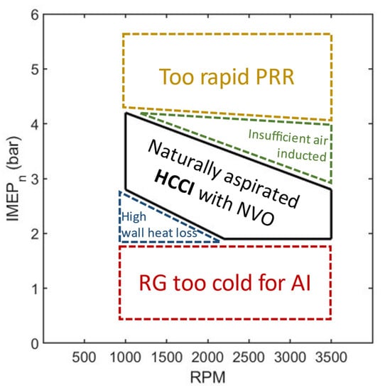 All of the CAI limiting effects listed above are summarised in Figure 1. The CAI operating map shown was adapted from Fu et al. [49] and was used as a baseline CAI engine throughout the paper. It represents a naturally aspirated, gasoline port fuel-injected, four-stroke, automotive engine that employs the CAI strategy of homogeneous charge compression-ignition (HCCI) and has a negative valve overlap (NVO) for trapping hot residual gases. A summary of the general discussion on the opportunities and challenges of CAI presented in the preceding sections is provided in Table 1.