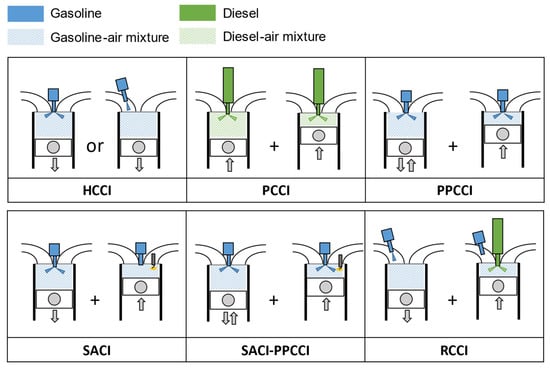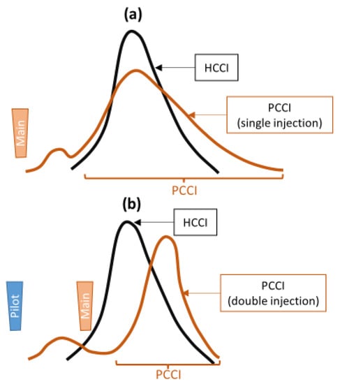 In the literature, diesel engines with early compression stroke injection have sometimes [25,69] been referred to as HCCI engines, but here, they are referred to as premixed to be consistent with the mixture preparation process requirements for DI HCCI engines defined earlier, i.e., injection during the intake stroke. Moreover, as there are non-negligible heterogeneities in the combusting mixture’s composition even with the relatively advanced injection, PCCI is considered a more apt characterisation.