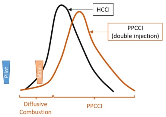 Qualitative HRR plots for HCCI and double injection PPCCI. Based on HRR curves in [41,69].