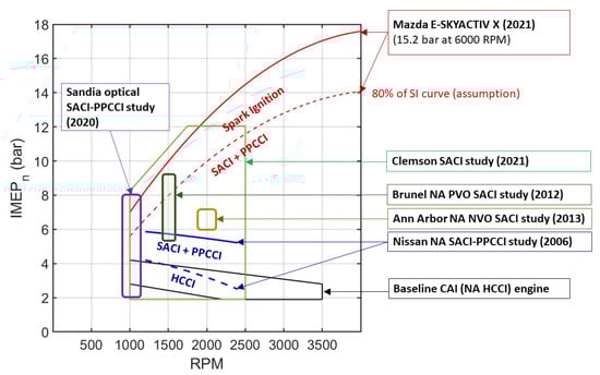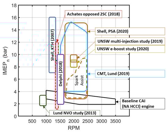 Two-stroke gasoline engine researchers were the first to study CAI [45,46,56,57]. They were interested in it as a means to stabilise low load performance. The inherently high fraction of hot residual gases that are trapped after scavenging in two-stroke engines were exploited to initiate multi-site CAI. Thus, improving the quality of combustion and reducing HC emissions, which were exceptionally high for the port fuel-injected (PFI) or carburetted engines. Even though two-stroke CAI achieved some commercial success [58], the cost of managing exhaust HC emissions via combustion and thermal efficiency improvements was too high compared to using valved, four-stroke engines that did not suffer from the gas-exchange problems inherent to the two-stroke architecture. Two-stroke engines have witnessed a resurgence in interest in recent times because of their potential to extend the high-load CAI operating limit [18,59,60,61,62].