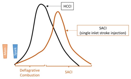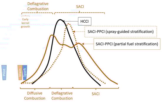 Figure 4 shows a qualitative comparison of heat release traces between HCCI and two-stage-injection PPCCI. The initial rise in the PPCCI trace is because of the diffusive combustion of the ignition-triggering injection, which is followed by a rapid rise when the background lean mixture auto-ignites. The HRR, and consequently the PRR, for PPCCI is lower than that for HCCI, thus allowing for more fuel to be injected and extending the high load limit. Moreover, no observable low-temperature heat release from the compression of the early injected fuel is present [69]. The lack of early heat release allows for the injection of large quantities of gasoline during compression without concerns about premature AI. Note, however, that such reactions can occur in gasoline CAI engines under certain in-cylinder thermal and chemical conditions [79].