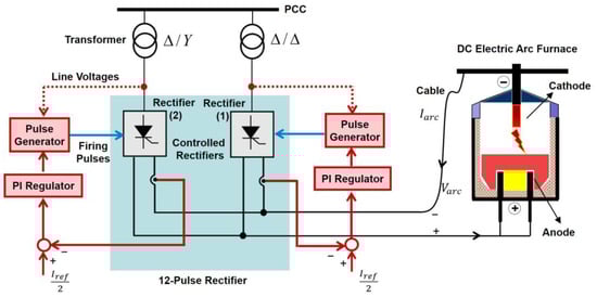 To minimize the current harmonics on the AC side and to reduce the DC output ripple, usually, the power source of the furnace includes a twelve-pulse rectifier. Moreover, the outputs of the bridge circuits are connected in parallel to double the load-feeding current. An essential issue in the performance of twelve-pulse rectifiers is the absorption of reactive power due to the operation with a variable firing angle (α).