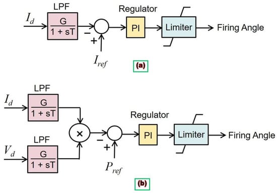 Then, after comparing with a set-point current, a PI regulator with a limiter is utilized to produce the firing angle of the rectifier. The CPC method is shown in Figure 3b for a rectifier. The output current and voltage of each rectifier are measured and passed through a low-pass filter with a gain of 1. Then, after multiplying these two signals, it is compared with a set-point power. By applying a PI regulator with a limiter, the firing angle of the rectifier is produced.